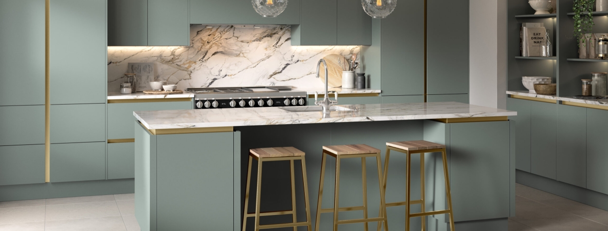 This involves using two different shades of the same colour (e.g., a light sage and a deep forest green) to create depth. It looks effortlessly sophisticated and is easy to achieve using our various matt door ranges, such as pairing Supergloss Cashmere with slightly darker stone tones.
